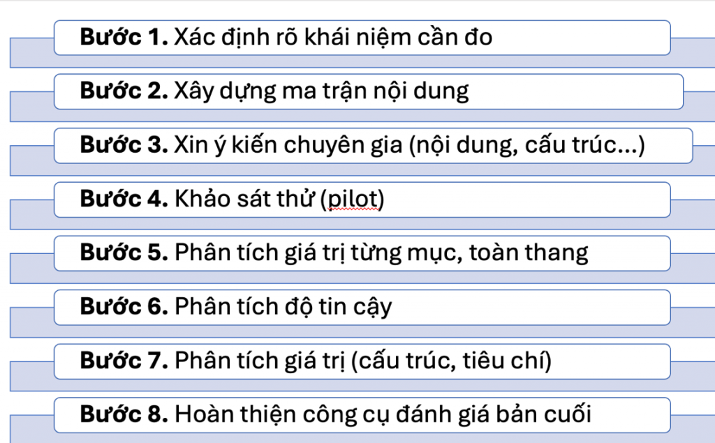 Một trong những nội dung trọng tâm được các cán bộ nghiên cứu quan tâm là các bước thực hiện xây dựng và kiểm định giá trị của một công cụ đánh giá. Theo khuyến nghị của báo cáo viên, quy trình nên được thực hiện theo 8 bước sau: