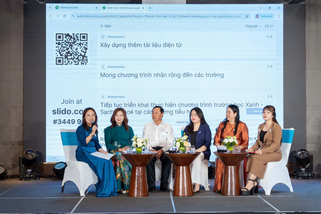 Phiên tọa đàm với chủ đề “Mô hình Trường học Xanh – Sạch – Khỏe: Bài học kinh nghiệm và định hướng tương lai” do Bà Nguyễn Thị Thanh Nga – Viện Khoa học Giáo dục Việt Nam điều hành với sự tham gia của bà Đoàn Thị Thuý Hạnh – Viện Khoa học Giáo dục Việt Nam, Bà Phạm Thị Hoài Thu – công ty Unilever Việt Nam, Ông Nguyễn Văn Liếng – Sở Giáo dục và Đào tạo thành phố Cần Thơ, Bà Nguyễn Thị Thanh Hà – Hiệu trưởng Trường tiểu học Hoà Khương – thành phố Đà Nẵng và cô Nguyễn Thị Diễm Thúy – Giáo viên tổng phụ trách trường Tiểu học Tân Thiềng A – tỉnh Vĩnh Long. Tại đây, các đại biểu đã trao đổi thẳng thắn về những thuận lợi, khó khăn trong quá trình triển khai, đồng thời đề xuất nhiều giải pháp nhằm nâng cao tính bền vững và khả năng nhân rộng của Chương trình trong thời gian tới.
